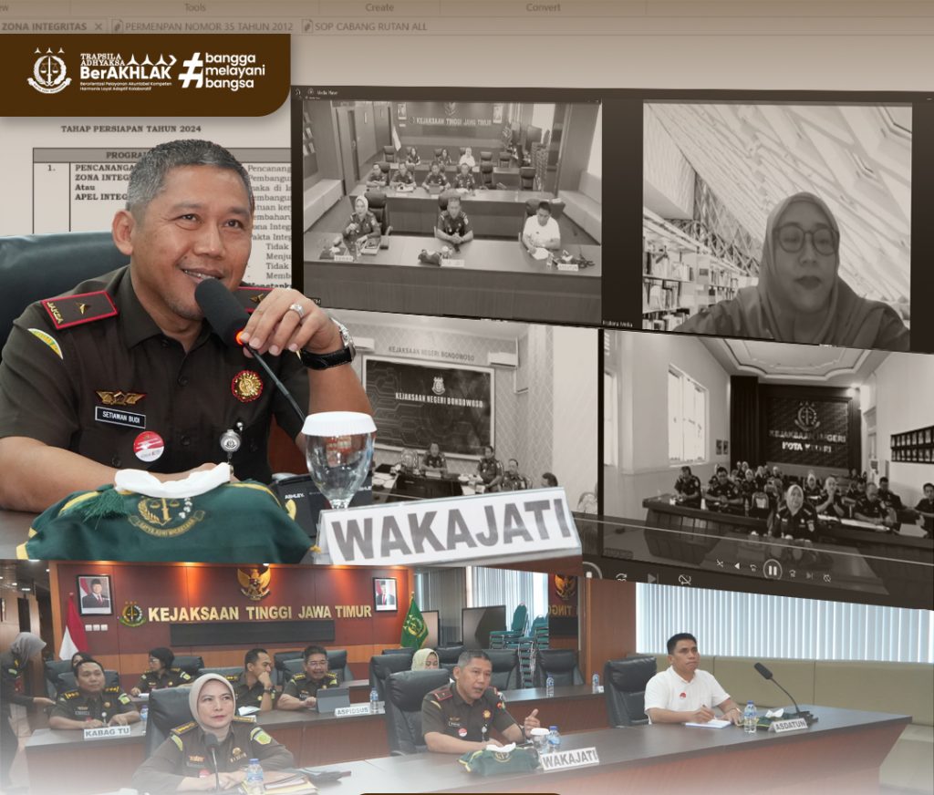 Surabaya – Kejaksaan Tinggi Jawa Timur (Kejati Jatim) mengambil langkah proaktif dalam mempersiapkan satuan kerjanya menghadapi penilaian lapangan untuk meraih predikat Wilayah Bebas dari Korupsi (WBK) dan Wilayah Birokrasi Bersih dan Melayani (WBBM) Tahun 2025. Sebagai bagian dari persiapan tersebut, Kejati Jatim menggelar pertemuan virtual melalui zoom meeting yang diikuti oleh 23 Kejaksaan Negeri di Wilayah Hukum Kejakaaan Tinggi Jawa Timur pada hari Rabu (09/04/2025)