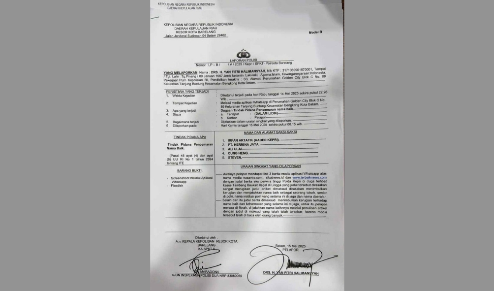 Lantaran artikel dan judul berita tersebut dianggap sangat merugikan. Terlebih lagi berita itu viral di media sosial yang notabene dibaca banyak orang. Tokoh Melayu yang bergelar Dato’ Sri Indera Pahlawan dan Dato’ Perdana Setya Buana ini merasa nama baik dan kehormatannya tercoreng, hingga akhirnya melaporkan kasus itu ke Polresta Barelang.