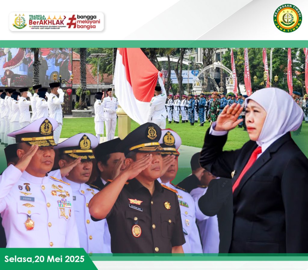 Surabaya – Wakil Kepala Kejaksaan Tinggi Jawa Timur, Setiawan Budi Cahyono, SH., M.Hum, turut menghadiri Upacara Peringatan Hari Kebangkitan Nasional (Harkitnas) ke-117 Tahun 2025 yang dipimpin langsung oleh Gubernur Jawa Timur, Khofifah Indar Parawansa di Gedung Negara Grahadi, Surabaya, Senin (20/5/2025).